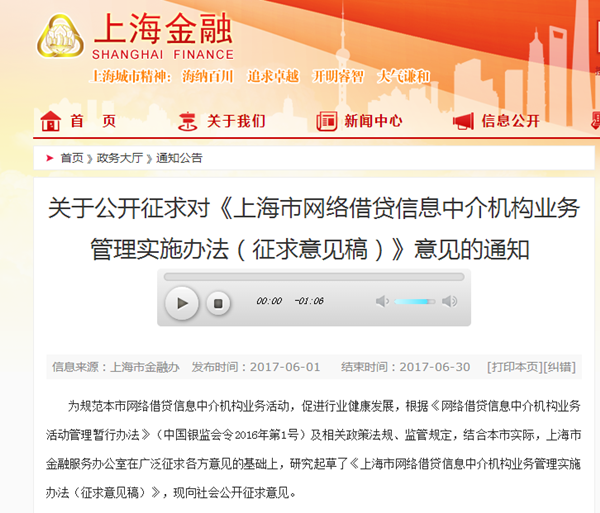 據(jù)中國(guó)網(wǎng)消息 6月1日,上海金融辦下發(fā)《上海市網(wǎng)絡(luò)借貸信息中介機(jī)構(gòu)業(yè)務(wù)管理實(shí)施辦法》(征求意見(jiàn)稿)(以下簡(jiǎn)稱(chēng)“征求意見(jiàn)稿”)。