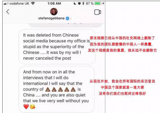之后,有網(wǎng)友就涉嫌歧視一事與被稱為D&G設(shè)計(jì)師的Stefano Gabban在社交媒體上表達(dá)不滿,結(jié)果該設(shè)計(jì)師又曝出上述稱“中國才是‘*’的國家”辱華言論。