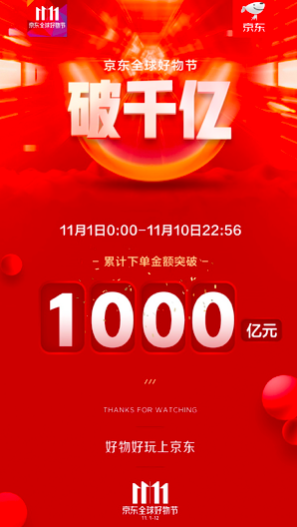 11月10日22點56分,京東11.11全球好物節(jié)累計下單金額突破1000億元。在9大主題日和7大專場活動的串聯(lián)下,京東聯(lián)動站內(nèi)站外、線上線下打造的11.11購物季高潮迭起。11月1日,超級秒殺日開門紅,下單金額超過258億元,超過1億件商品迅速飛到消費者手中。11月3日,超級神券日,“滿199減100”成為最受消費者歡迎的“神券”。