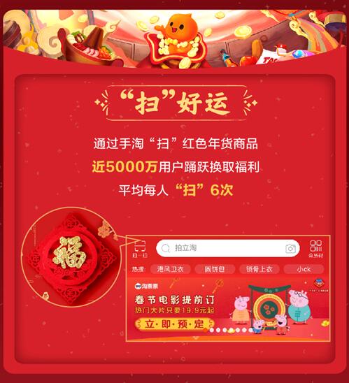 今年,支付寶首次聯(lián)動淘寶每天派送100萬張?āOM者打開手機淘寶,點擊首頁左上角“掃一掃”或者搜索框“拍立淘”,對準紅色的年貨商品,識別后即可以有機會獲得支付寶?ɑ蛘呓鹭i等實物獎勵。淘寶數(shù)據(jù)顯示,近5000萬用戶踴躍換取淘寶派送的新春福利,平均每人“掃”6次紅色年貨。