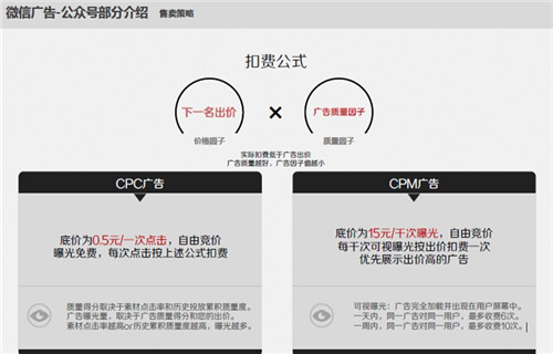 資料顯示,微信CPC廣告底價為0.5元/一次點擊,自由競價,曝光免費;CPM廣告底價為15元/千次曝光,自由競價,每千次可視曝光按出價扣費一次,優(yōu)先展示出價高的廣告。