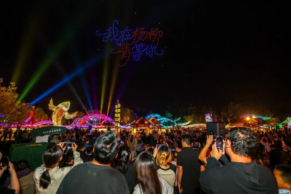 華燈初上,月夜未央。古鎮(zhèn)內(nèi)的“趕大營”實景演出剛剛落下帷幕,余韻未消,不遠(yuǎn)處運河邊白石橋水幕開啟,沿河兩岸十?dāng)?shù)組年畫燈組流光溢彩,一艘游船畫舫順流而下,將“北國江南,沽上揚州”的漕運繁盛演繹得淋漓盡致。此刻的天空中,一場精彩絕倫的孔明燈+無人機(jī)秀正悄然上演。