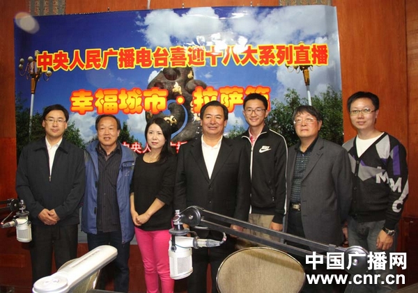 拉薩市委副書記、市長多吉次珠在直播前與中央人民廣播電臺(tái)和西藏人民廣播電臺(tái)編播人員合影留念