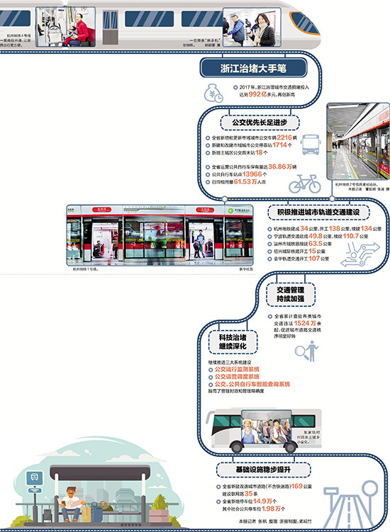大力治理交通擁堵,加快公交、地鐵設(shè)施建設(shè),是2017年浙江省十大民生實事之一。一年多來,杭州地鐵2號線全線貫通,4號線南段開通,地鐵網(wǎng)骨架基本搭建完成,日均客流量超過120萬人次。在交通運(yùn)輸部剛剛發(fā)布的報告中,杭州已從上一年的“中國堵城第8位”迅速下滑到第48位。