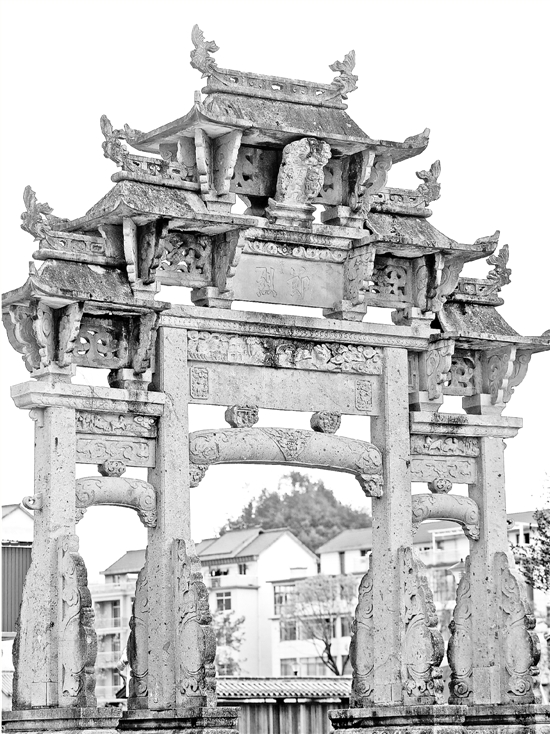 這座牌坊存世170年。汾口村的古稀老人余老先生自打記事起,牌坊就已經(jīng)立在了村口。歲月悠悠,牌坊背后大片的良田如今成了村莊,泥濘的村道成了寬闊的柏油馬路,唯有這座牌坊,依然矗立不語。