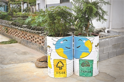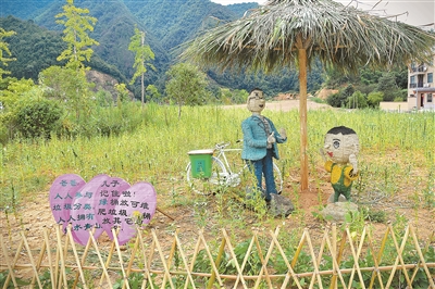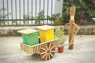 稻草、廢棄的木材、廢棄的自行車(chē)零件等,這些原本在農(nóng)戶(hù)眼里的垃圾,經(jīng)過(guò)巧妙的整理,成為了一個(gè)個(gè)裝飾的元素,就連墻上的垃圾分類(lèi)宣傳語(yǔ)也轉(zhuǎn)化成了“爸爸和兒子間對(duì)話”,讓人感到既新鮮又通俗易懂。