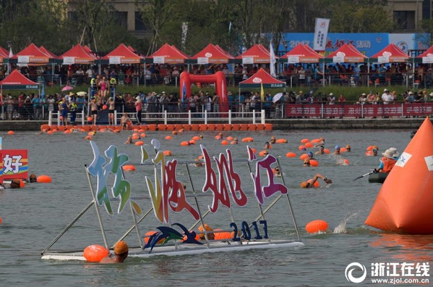 8月6日,2017寧波橫渡姚江活動在江北區(qū)雙古渡公園姚江水域舉行,500名游泳選手頭頂烈日,橫渡母親河。(浙江在線拍友 龔國榮 攝)