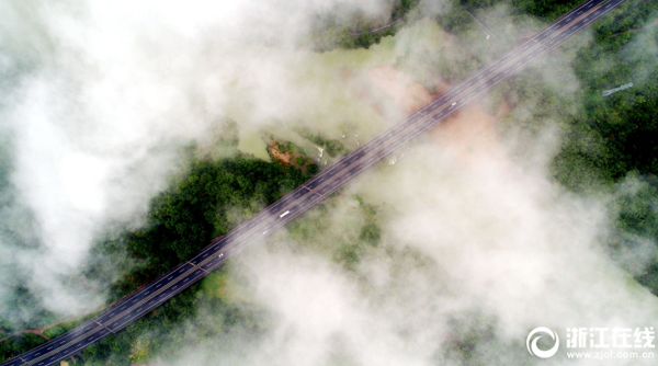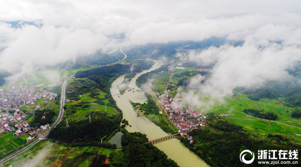 8月26日,航拍云霧繚繞的仙居縣官路鎮(zhèn)鄉(xiāng)間田園。