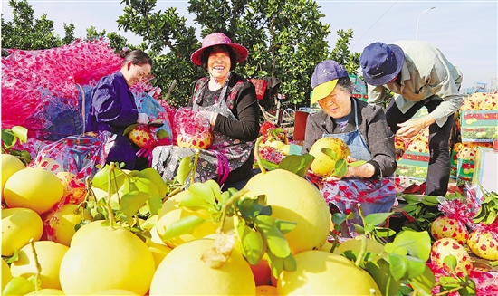 11月10日,在玉環(huán)市清港果園,樟岙合作社社員正在采摘、包裝文旦,銷往武漢。玉環(huán)3.17萬畝文旦已全面進入采摘銷售期,今年總產(chǎn)量達(dá)2.35萬噸。