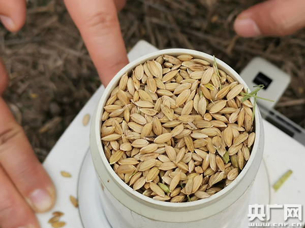 根據(jù)《浙江省水稻測(cè)產(chǎn)驗(yàn)收辦法》,專(zhuān)家組對(duì)該田塊采用收割機(jī)全田實(shí)割測(cè)產(chǎn)。實(shí)割面積為1.005畝,濕谷總產(chǎn)為1217.48公斤,采用種子標(biāo)準(zhǔn)法測(cè)定水分和凈度,折成標(biāo)準(zhǔn)水分(14.5%)后,測(cè)得干凈的干谷畝產(chǎn)為1106.39公斤,打破該田塊在2017年創(chuàng)造的1071.51公斤/畝的紀(jì)錄,成為浙江單季晚稻最高畝產(chǎn)的新坐標(biāo)。
