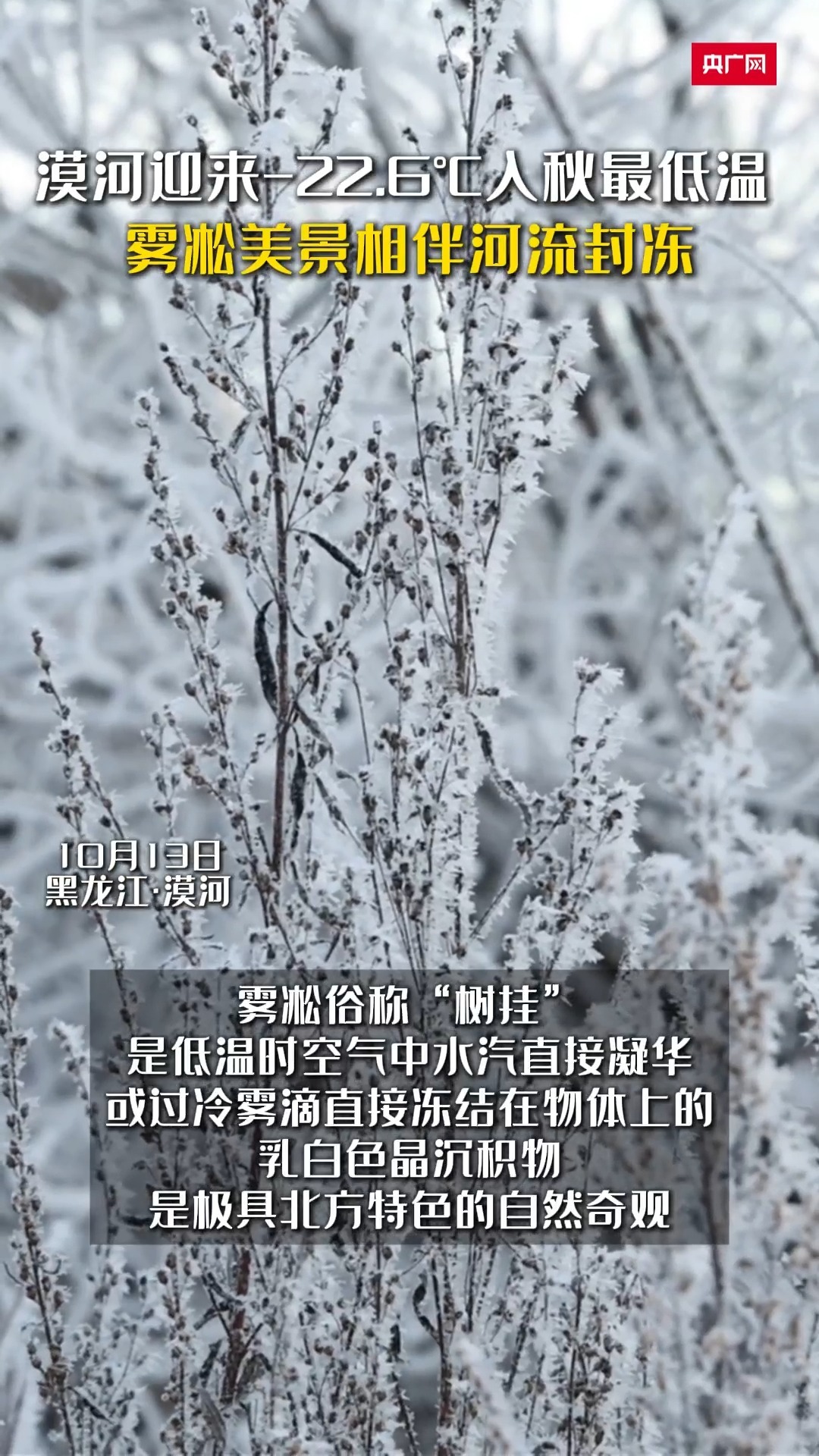 10月13日早晨漠河境內(nèi)最低氣溫達(dá)到-22.6℃,迎來入秋最低溫,江河進(jìn)入冰封時(shí)節(jié),霧凇美景也如約而至。